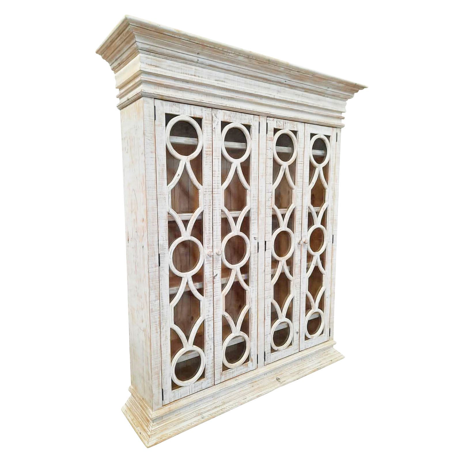 The Ashton Cabinet will enhance the ambiance of any room with its stately crown molding, multi-step distressed hand finish and tall glass panel doors. At nearly eight feet high this piece offers plenty of room for your personal library or displaying your treasured pieces. As with all of our furniture, each is crafted and finished by hand making it one of a kind.