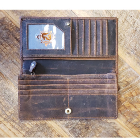 The Casey ladies wallet is crafted from Crazy Horse Leather. This full-grain cowhide leather is finished with a natural wax and buffed to give it a handsome appearance that will patina with use making it uniquely yours.