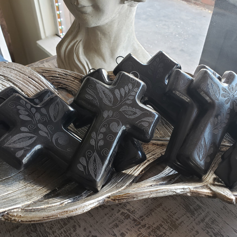Handmade wall hanging cross made from natural black clay with intricate burnished designs. Variety of sizes and designs.