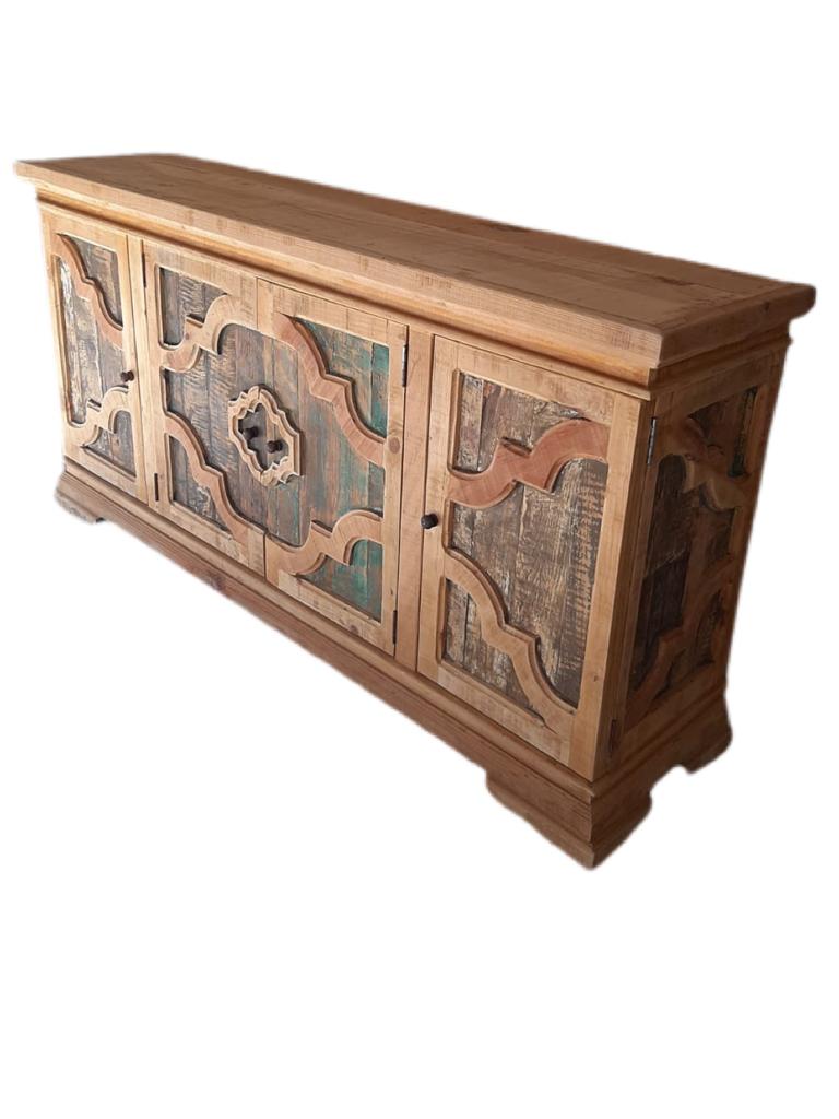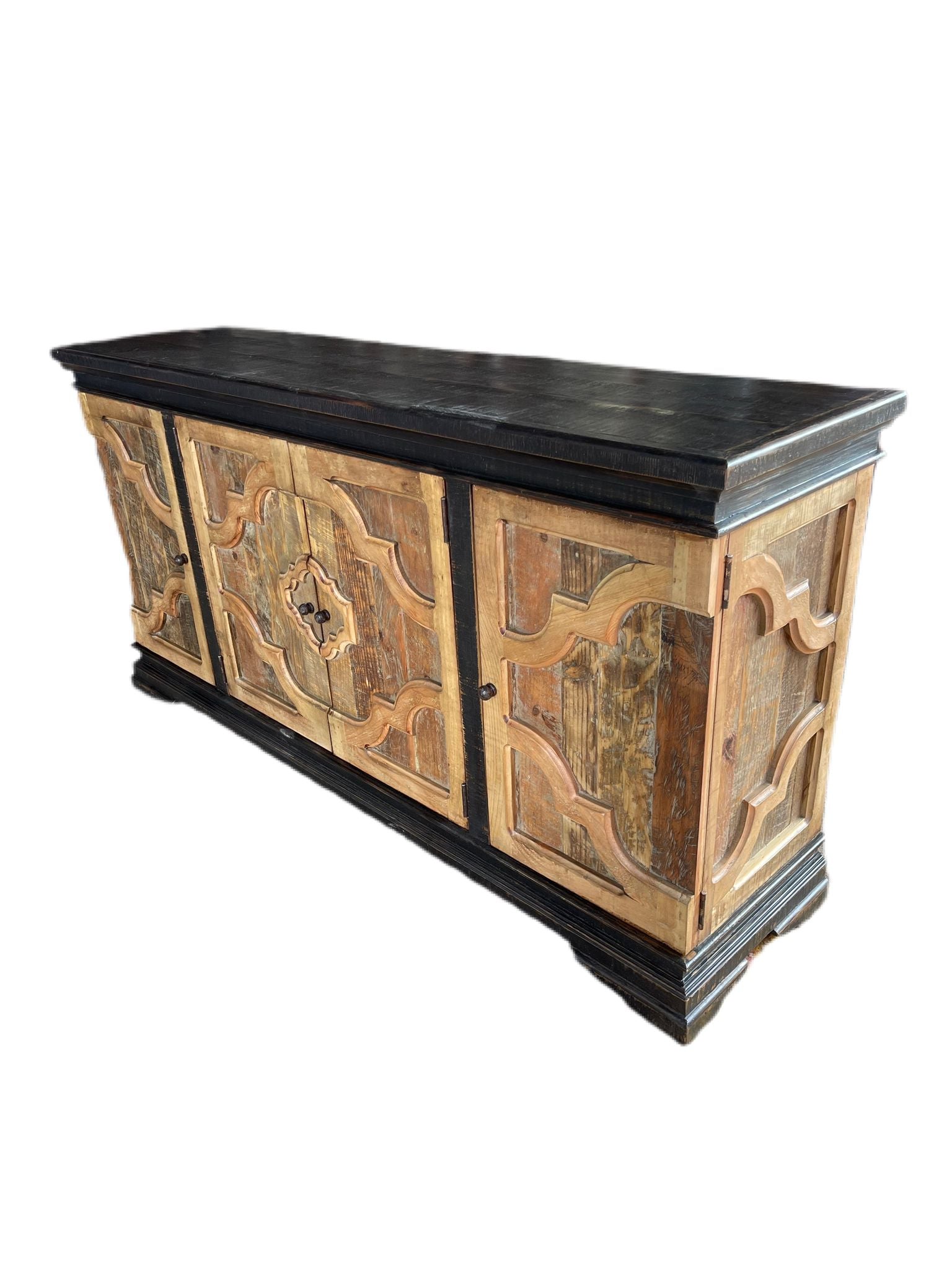 The Hanson console is crafted from a mix of new and reclaimed wood and features details such as handmade iron knobs and decorative door panels that wrap around the sides. The multi-step finish combined with authentic reclaimed wood from old cabins creates the appearance of a vintage heirloom. Equipped with four doors and ample storage space it’s sure to be both stunning and useful in any room.