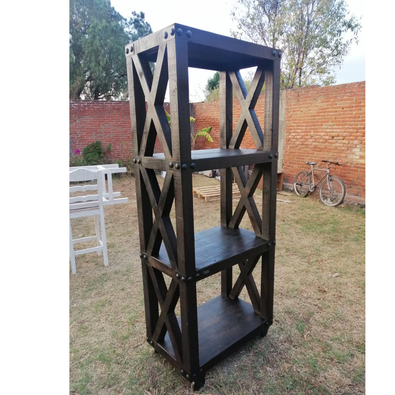 The Martin bookcase is crafted from solid wood and accented with handmade iron straps and nails and sits atop 4 vintage style cast iron wheels. It provides ample storage space and is sure to be both stunning and useful in any room.